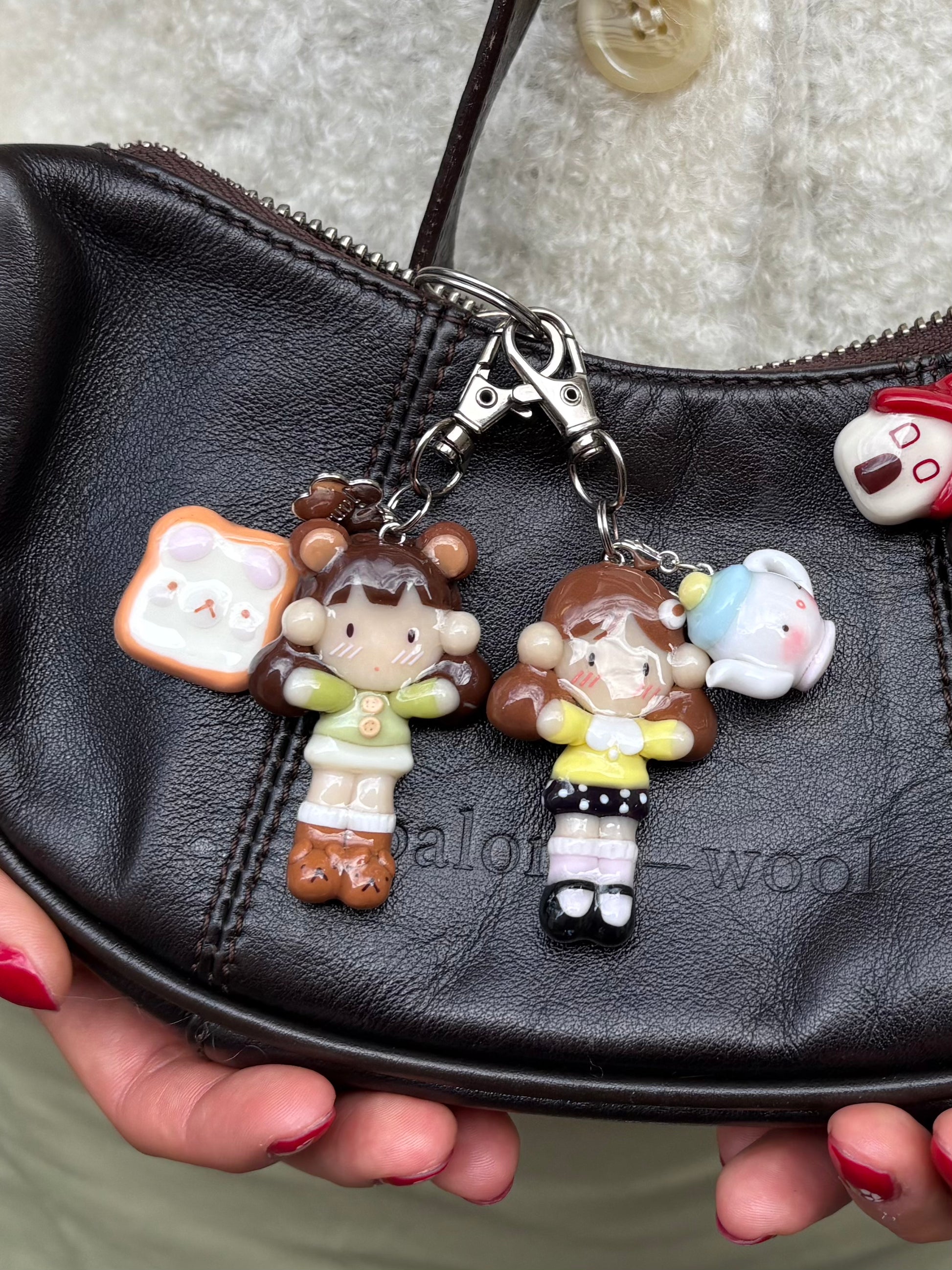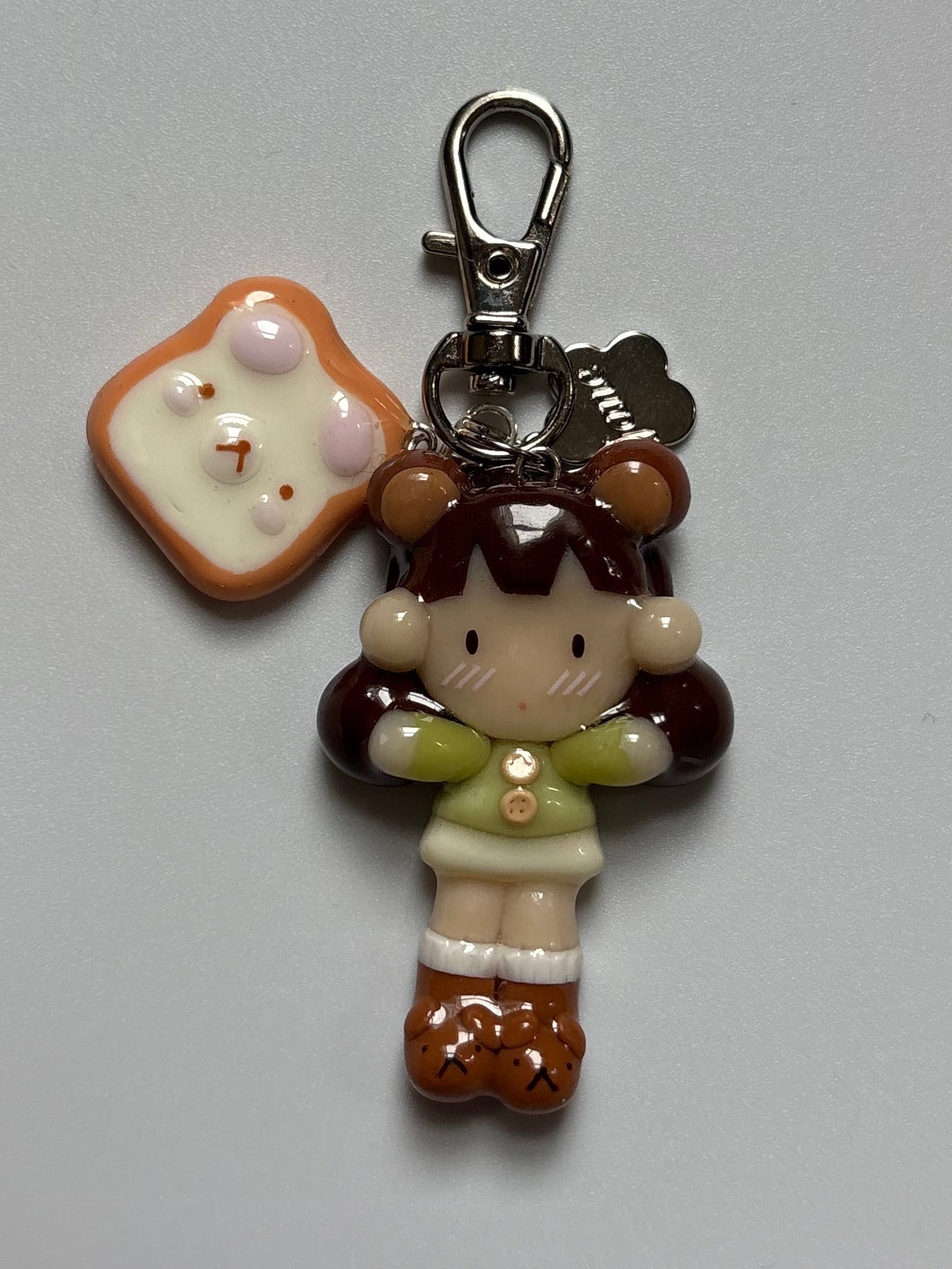 𐙚 Charm description ~1.75~2" charm of a girl wearing a green sweater, and teddy bear boots. Accessorized with bear ears. She comes with a little milk bread charm with bear face detailings, can clipped on and off the main keychain <3