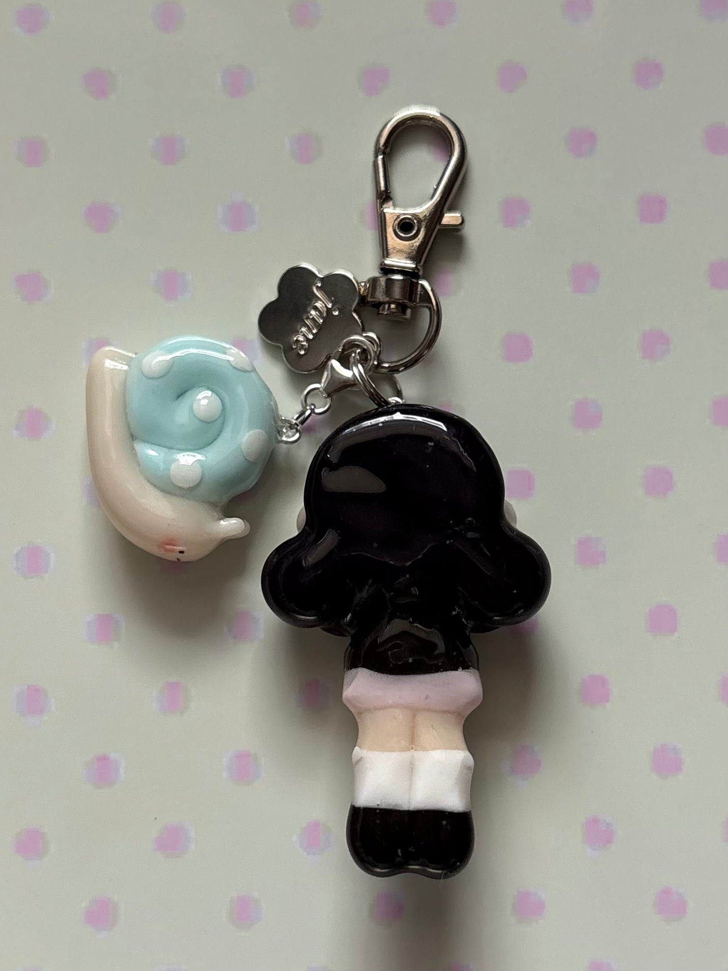 𐙚 Charm description ~1.75~2" charm of a girl wearing a black peacoat with cream buttons, pleated mini skirt & black ballet flats. She comes with a little snail companion that can be clipped on and off the main keychain <3