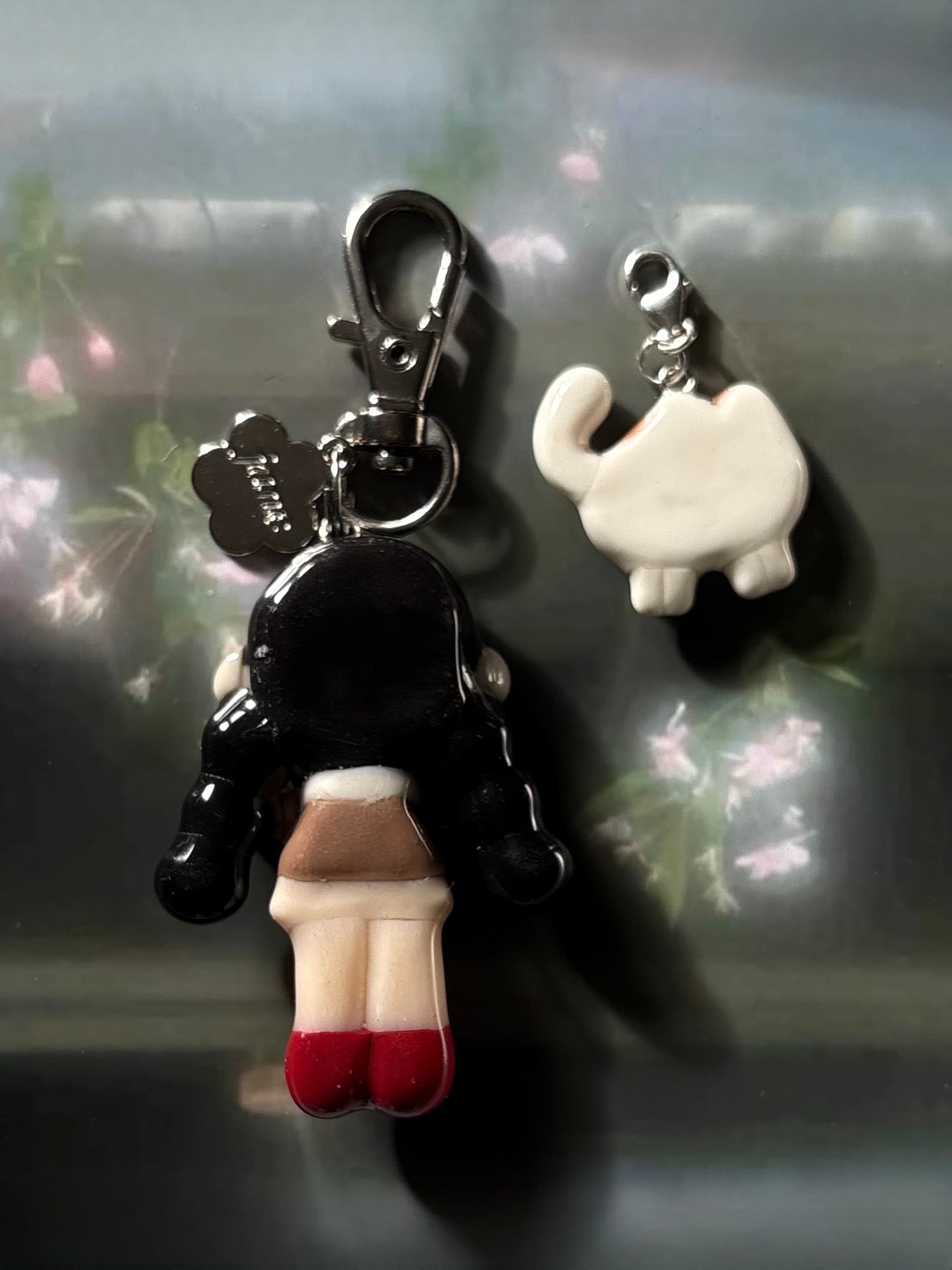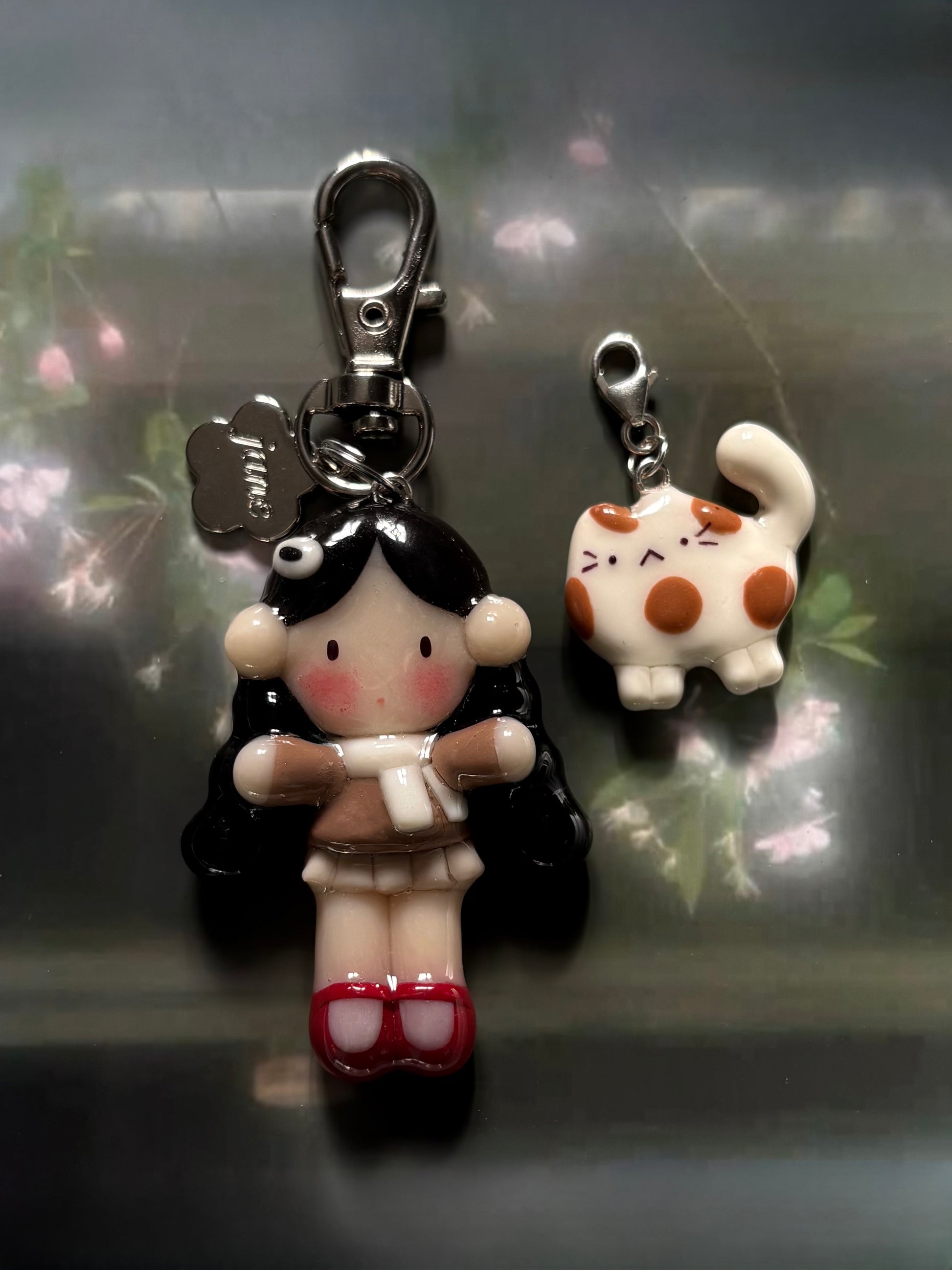 𐙚 Charm description ~1.75~2" charm of a girl wearing a white scarf over a brown cardigan and pleated skirt. Accessorized with a white hair clip. She comes with a little cat charm, "cookie" that can be clipped on and off the main keychain <3