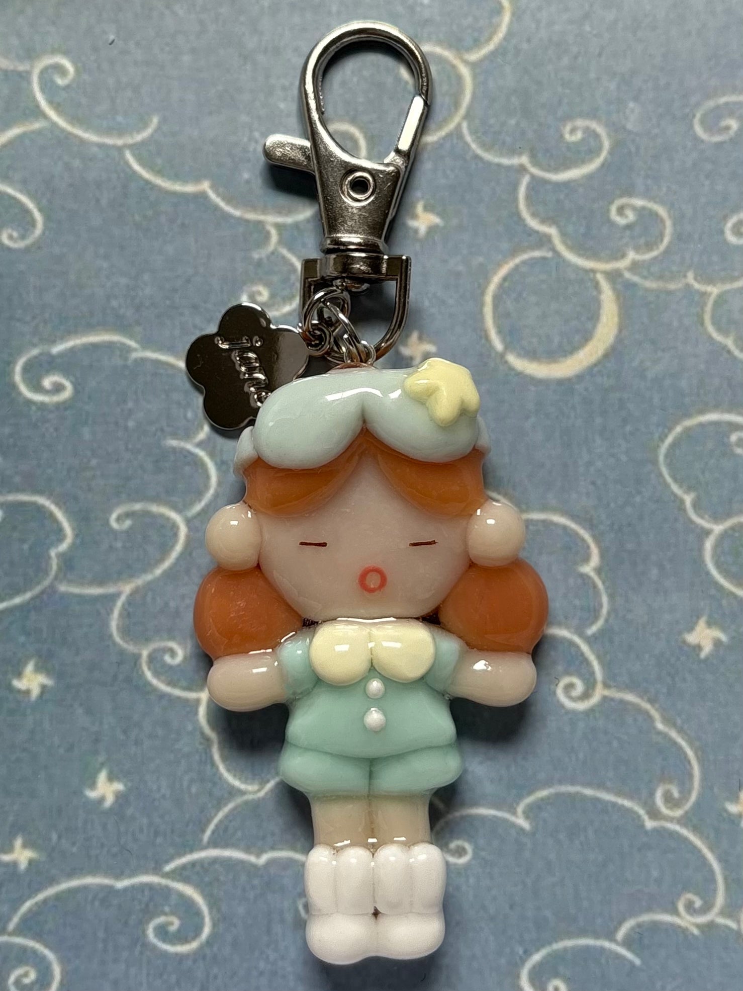 𐙚 Charm description ~2” charm of a girl wearing a sleep mask with a little yellow star, a baby blue pajama set, and bunny slippers. Pairs with mini charm, yellow star