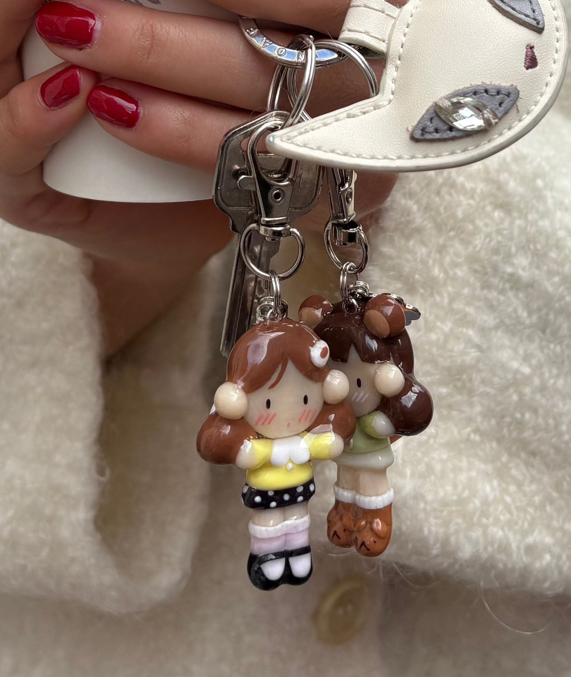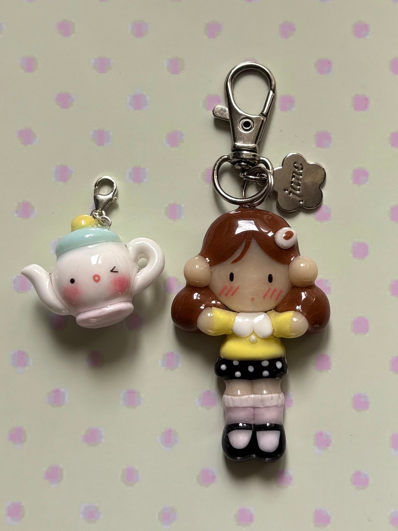 𐙚 Charm description ~1.75~2" charm of a girl wearing a butter yellow sweater with a white collar, black polkadot mini skirt, black ballet flats with pink socks. Accessorized with a white hair clip. She comes with a teapot charm that can clipped on and off the main keychain <3